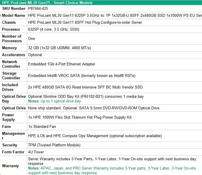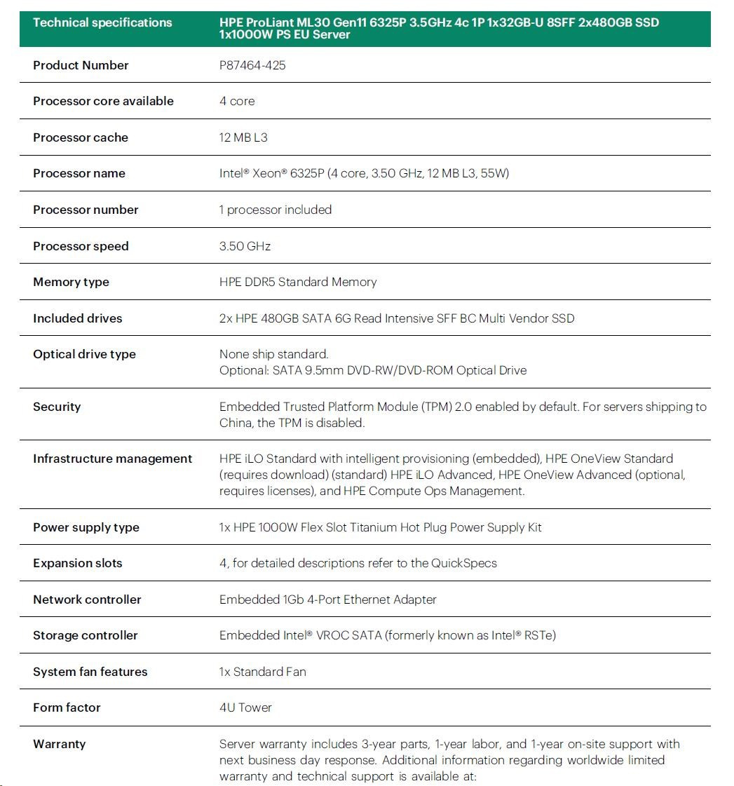 Provedení serveru:Tower; Výrobce CPU:Intel; Maximální počet procesorů:1; Řada procesorů:Intel 4 Core Xeon; SSD Kapacita (GB):960; Model procesoru:Intel Xeon E-2434; Velikost paměti RAM (GB):32; Maximální paměťová kapacita serveru (GB):128; Maximální počet slotů PCIe:4; Maximální počet HDD v serveru:8; Hot-plug cage pro HDD:2.5" SFF; RAID:1, 5, 10.Více