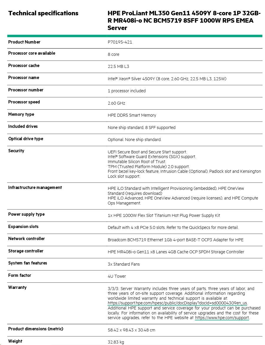 P70195-421: HPE ProLiant ML350 Gen11 4509Y 8-core 1P 32GB-R MR408i-o NC BCM5719 8SFF 1000W RPS EMEA Server