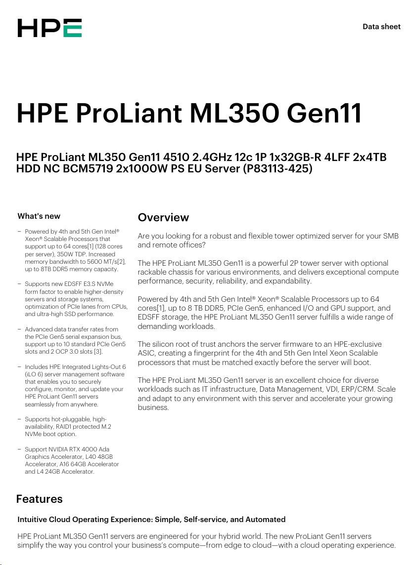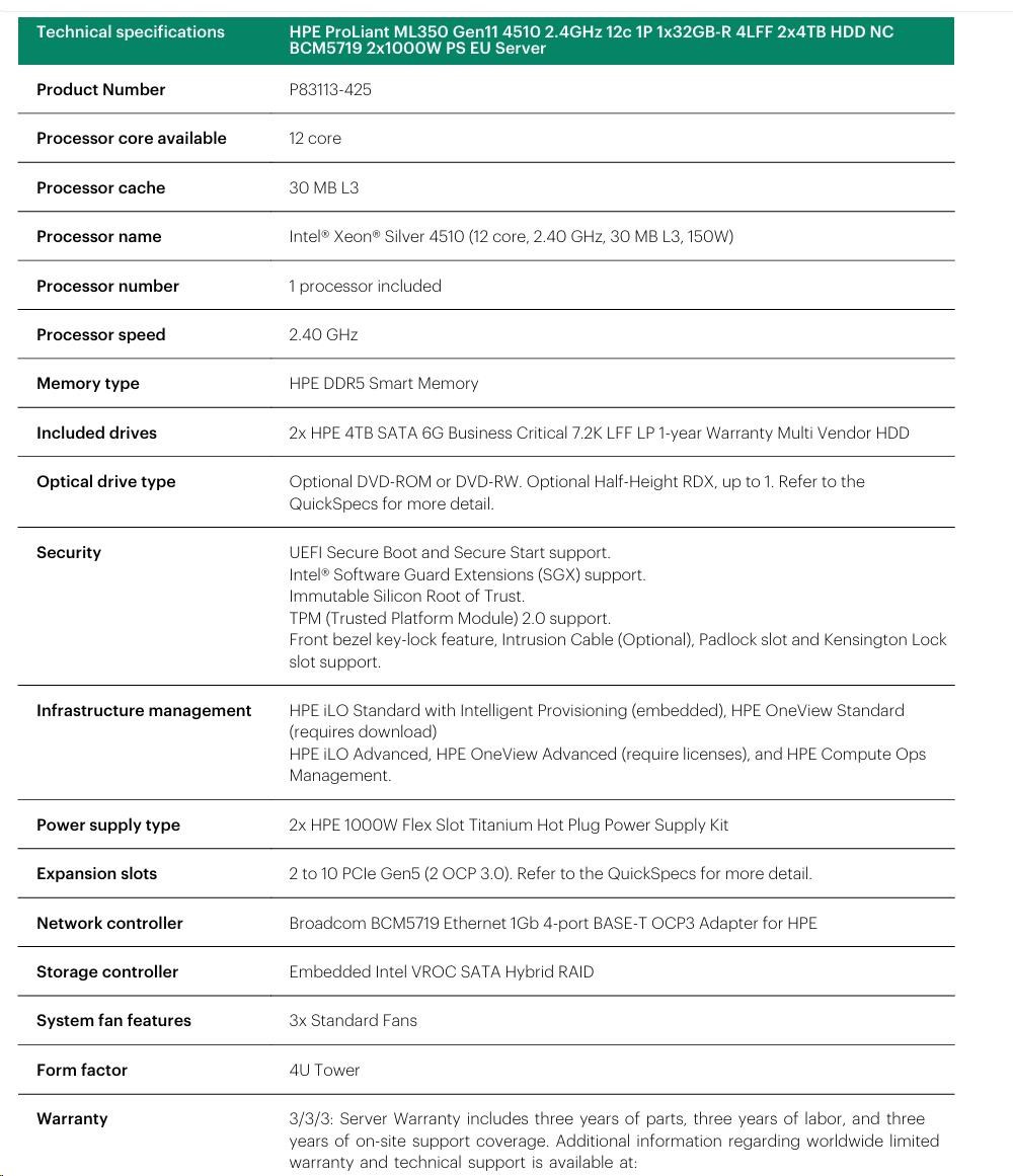 HPE PL ML350g11 4510 (2.4G/12C) 1x32G (P64706) 2x4TB/7.2k SATA 4LFF VROC 2x1000W 4p1G Smart Choice