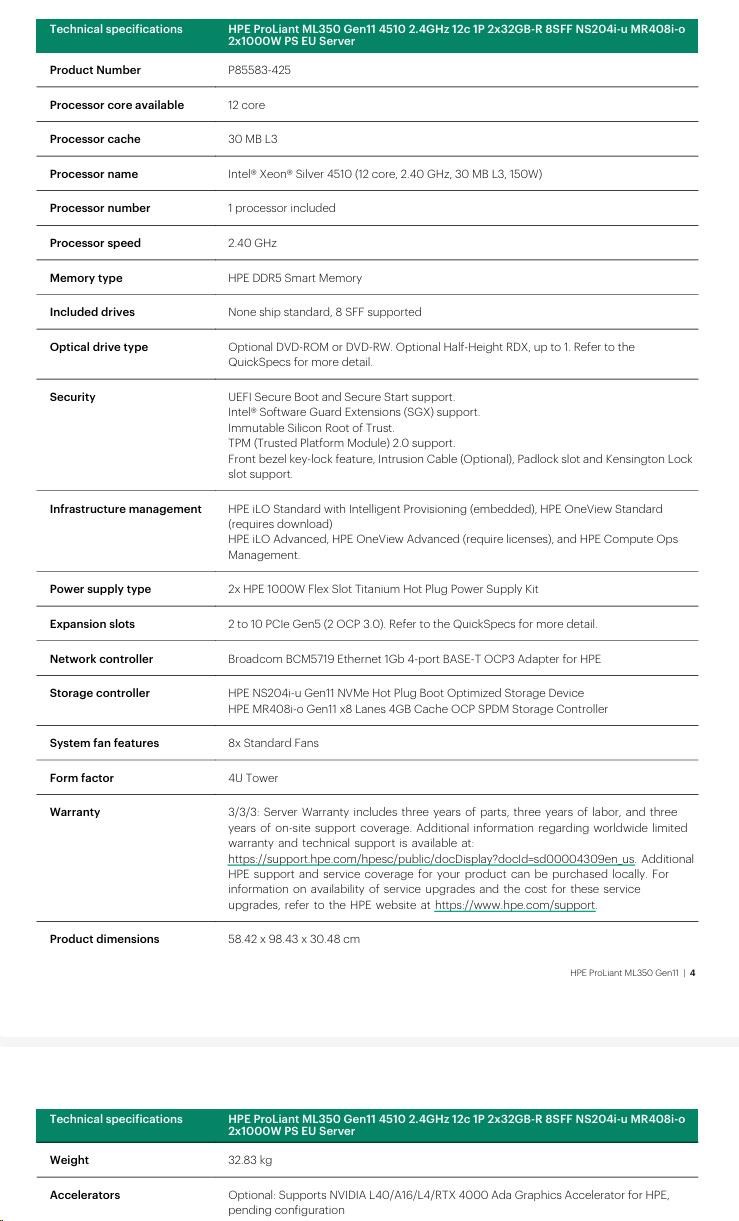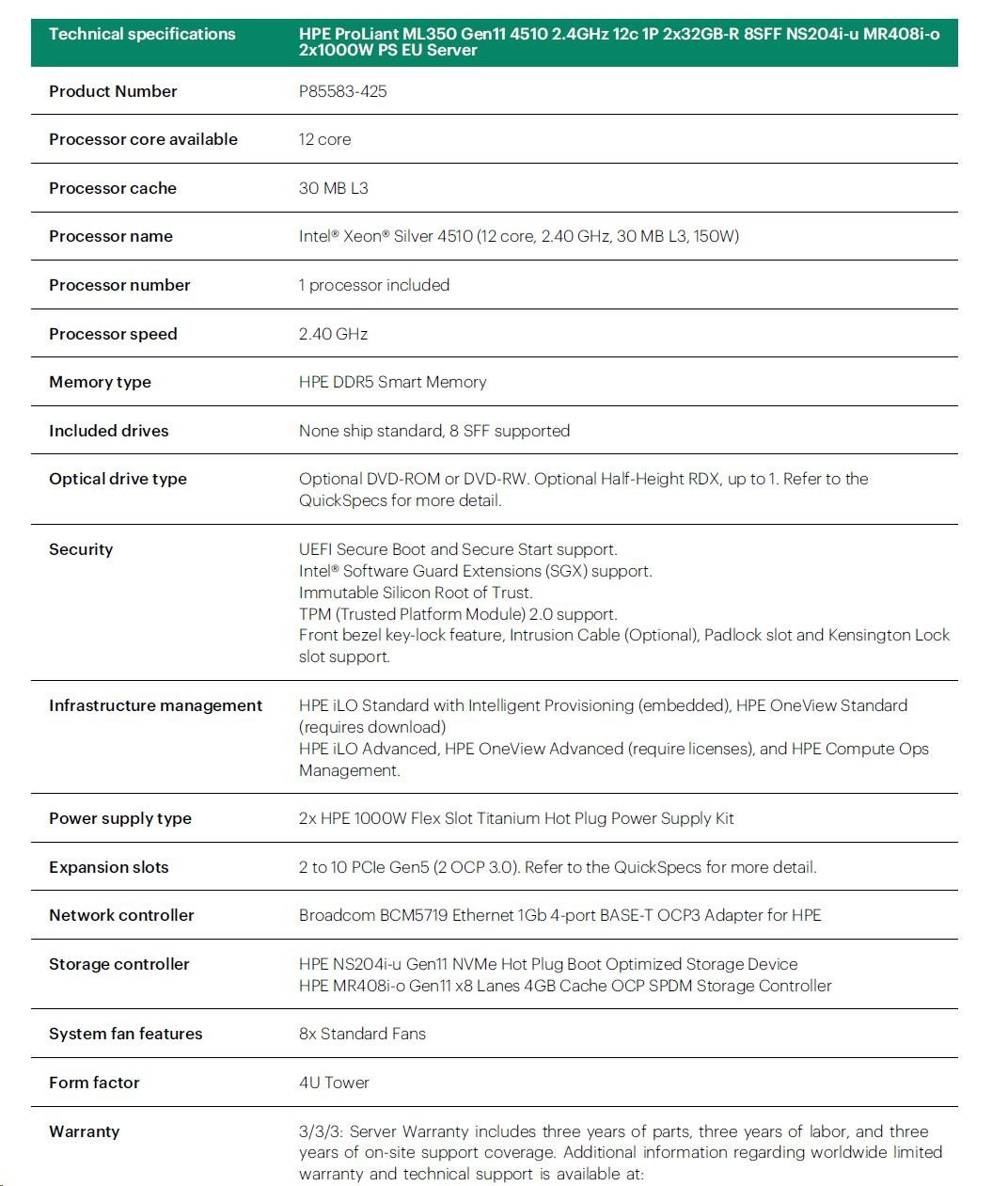 Provedení serveru:Tower; Výrobce CPU:Intel; Maximální počet procesorů:2; Řada procesorů:Intel 12 Core Xeon; SSD Kapacita (GB):480; Model procesoru:Intel Xeon 4410Y; Velikost paměti RAM (GB):64; Maximální paměťová kapacita serveru (GB):3072; Maximální počet slotů PCIe:6 a více; Maximální počet HDD v serveru:24; Hot-plug cage pro HDD:2.5" SFF; RAID:1, 5, 10.Více