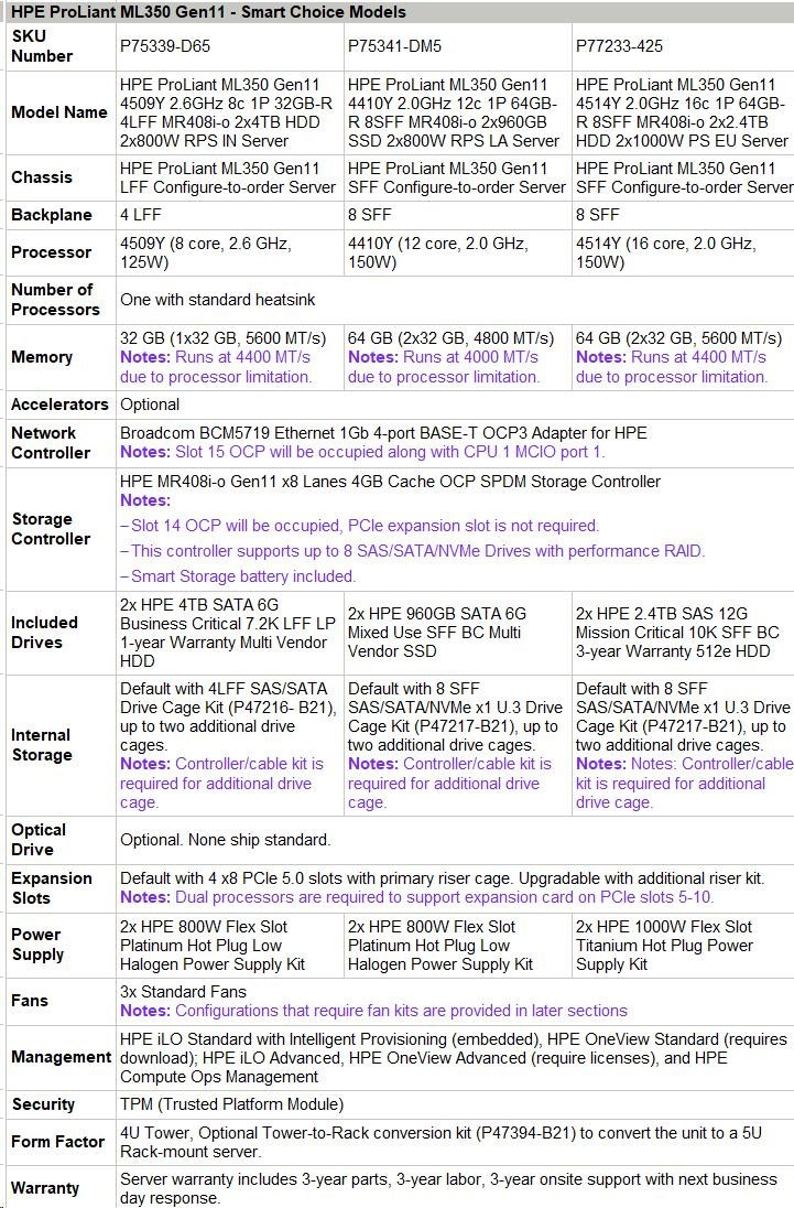 Model Name HPE ProLiant ML350 Gen11 4514Y 2.0GHz 16c 1P 64GB-R 8SFF MR408i-o 2x2.4TB HDD 2x1000W PS EU Server