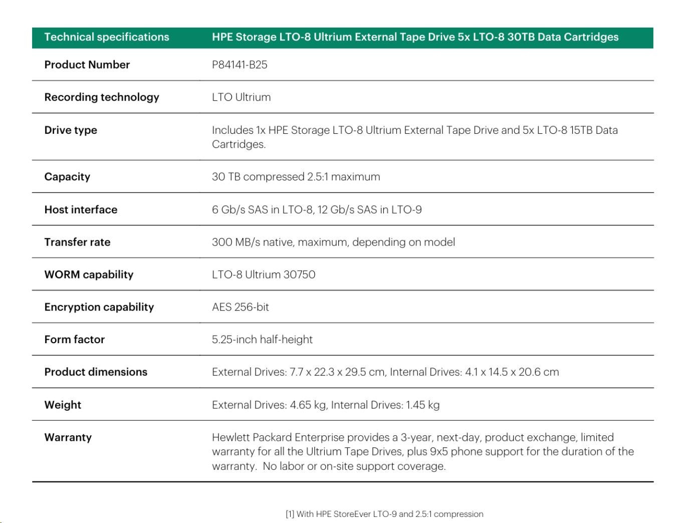 HPE Storage LTO-8 Ultrium External Tape Drive (+5x Q2078A LTO-8 30TB Data Cartridges) Smart Choice