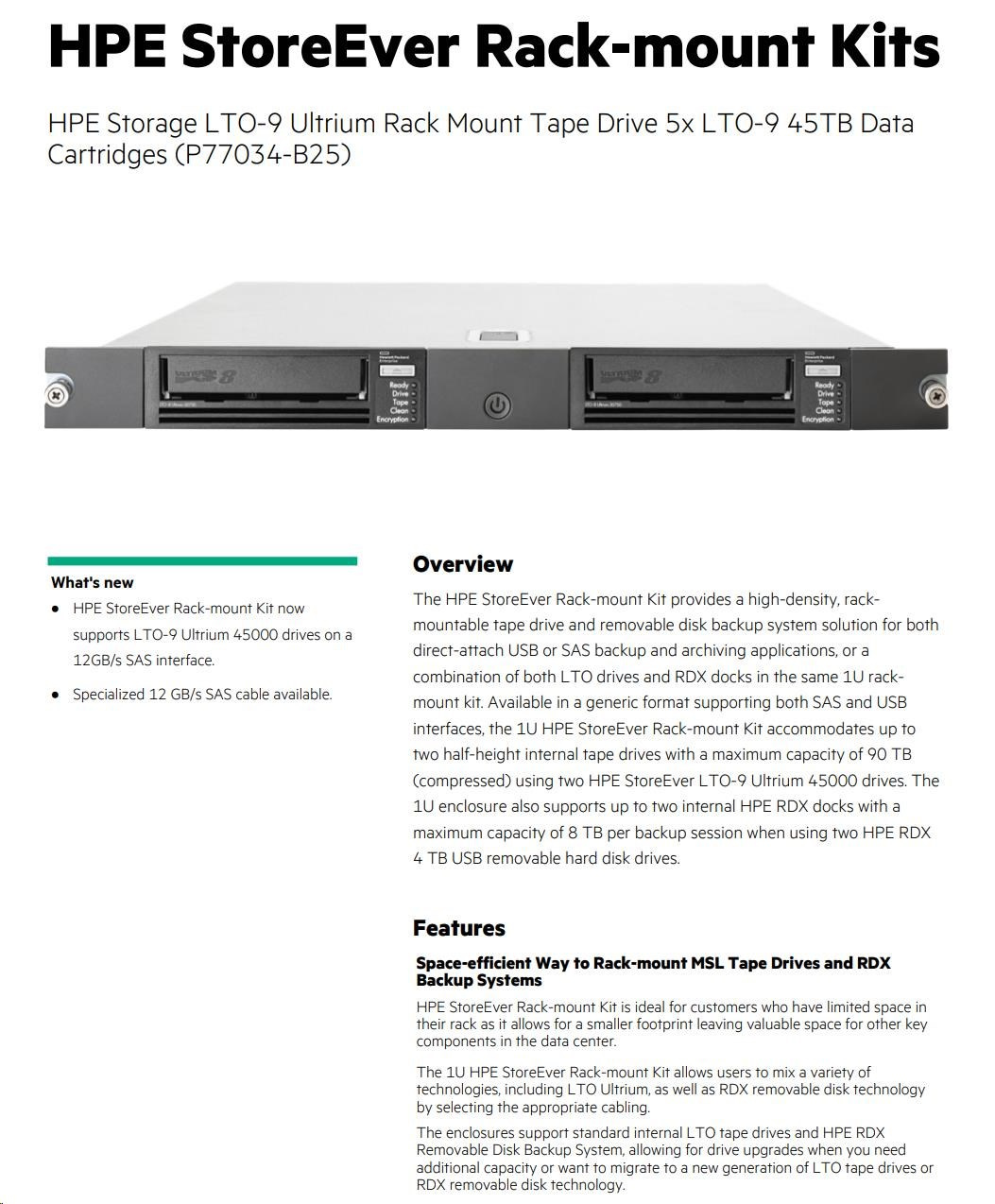 HPE StoreEver Rack-mount Kit is ideal for customers who have limited space in their rack as it allows for a smaller footprint leaving valuable space for other key components in the data center. The 1U HPE StoreEver Rack-mount Kit allows users to mix a variety of technologies, including LTO Ultrium, as well as RDX removable disk technology by selecting the appropriate cabling. The enclosures support standard internal LTO tape drives and HPE RDX Removable Disk Backup System, allowing for drive upgrades when you need additional capacity or want to migrate to a new generation of LTO tape drives or RDX removable disk technology.Data sheet Page 2 Provides up to 90 TB of storage capacity (assuming 2.5:1 compression) using two LTO-9 Ultrium 45000 drives or up to 8 TB of storage capacity using two RDX 4 TB removable hard disk drives. Data transfer rates up to 300 MB/s using LTO-7, LTO-8, or LTO-9 Ultrium drives or up to 30 MB/s using two RDX removable hard disk drives.