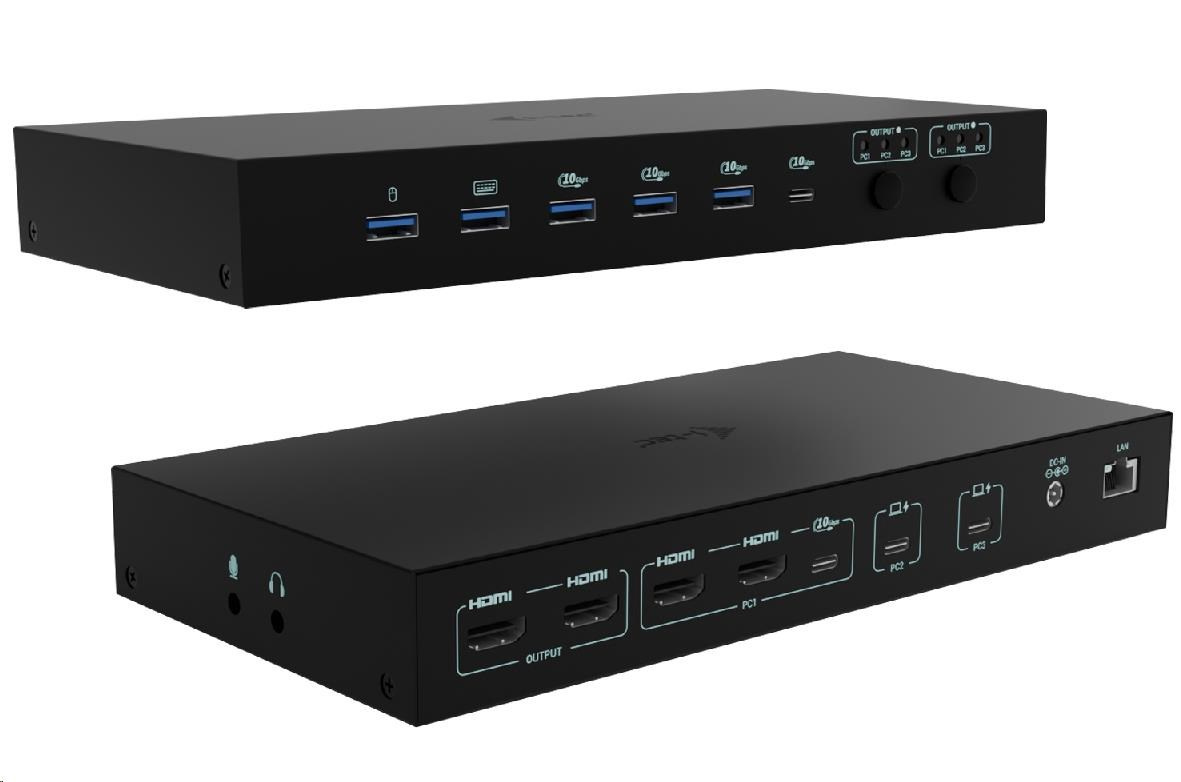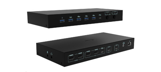 Tato vysoce výkonná dokovací stanice umožňuje současné připojení až tří hostitelských zařízení – jednoho PC nebo herní konzole a dvou notebooků či tabletů. Je plně kompatibilní se zařízeními s porty USB-C, USB4 nebo Thunderbolt 3/4/5. Počítače nebo konzole lze připojit přes HDMI a USB.
