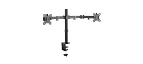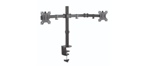 Stolní držák pro dva monitory 17-27" s policí na klávesnici, ergonomický pro práci vsedě nebo vestoje, kompletní polohovatelnost, VESA 75x75 a 100x100, nosnost 15kg.