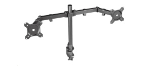 Stolní držák pro dva monitory 17-27" s policí na klávesnici, ergonomický pro práci vsedě nebo vestoje, kompletní polohovatelnost, VESA 75x75 a 100x100, nosnost 15kg.