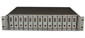 15 slotů pro media konverotry, 19"/2,5U, napájení AC 230V, možno dokoupit DC 48V zdroj (redundance).