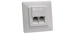 Síťová zásuvka PremiumCord CAT 6a Class EA se dvěma porty RJ45 pro montáž na nebo pod omítku. Vhodná pro vysokorychlostní datové a síťové instalace.