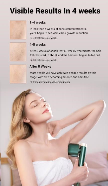 Použití přístroje je neuvěřitelně snadné a rychlé. Nejprve oholte oblast, kterou si přejete ošetřit. Poté jednoduše přiložte hlavici přístroje k pokožce a aplikujte jemný světelný pulz přímo ke kořínku chloupku. Pro nejlepší výsledky doporučujeme každé místo ošetřit dvěma po sobě jdoucími záblesky. Pro optimální výsledky dodržujte následující plán: první dva týdny používejte přístroj třikrát týdně, abyste zpomalili růst chloupků. Během 3. a 4. týdne snižte frekvenci na dvakrát týdně pro dosažení trvalého odstranění chloupků. Po této úvodní kúře stačí přístroj použít jednou za měsíc pro případné udržovací ošetření a pro zachování dokonale hladké pokožky.