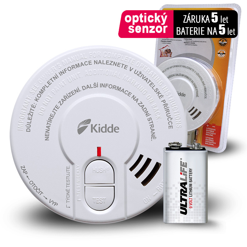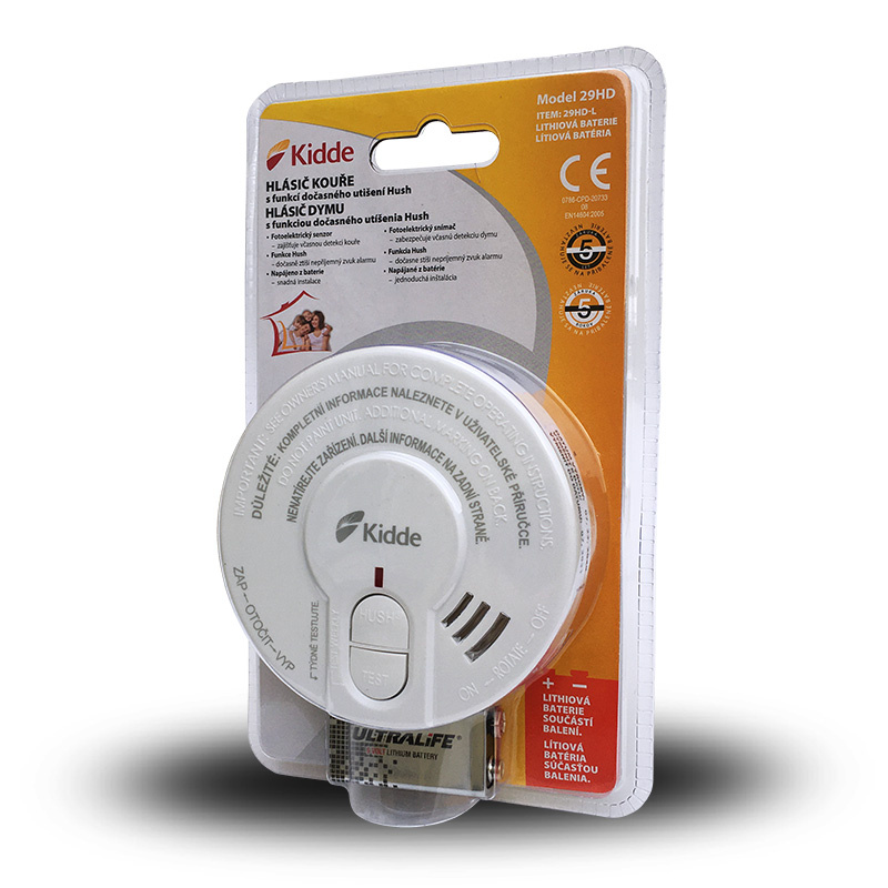 Hlásič požáru je vybaven testovacím tlačítkem TEST pro kontrolu správného fungování zařízení a HUSH pro přechodné umlčení požárního hlásiče pro případ planého alarmu. Stisknutí tlačítka způsobí okamžitou deaktivaci alarmu, na dobu asi 10minut, snížení citlivosti obvodů a vypnutí akustické signalizace hlásiče. Tlačítko HUSH používejte pouze tehdy, pakliže znáte příčinu aktivace hlásiče (např. při vaření nebo smažení). Po cca 10 minutách od deaktivace hlásiče se tento zcela automaticky resetuje do původního nastavení pro monitorování nebezpečí požáru. Pokud v místnosti zůstane vysoká koncentrace kouře, můžete stisknout tlačítko HUSH opakovaně a to až do okamžiku kdy je místnost řádně odvětrána. Tento model je vybaven nejmodernějším fotoelektrickým senzorem Kidde.