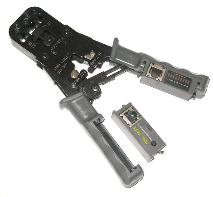 Kleště jsou určeny profesionálům ke krimpování konektorů RJ11, RJ12, RJ45. Vysoká trvanlivost a odolnost včetně odizolovávače a ráčny Tester s LED indikací v rukojeti