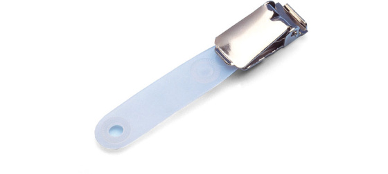 Kovový klips pro uchycení visačky s předděrovaným oválným otvorem. Mléčná plastová šle otočná o 180°..