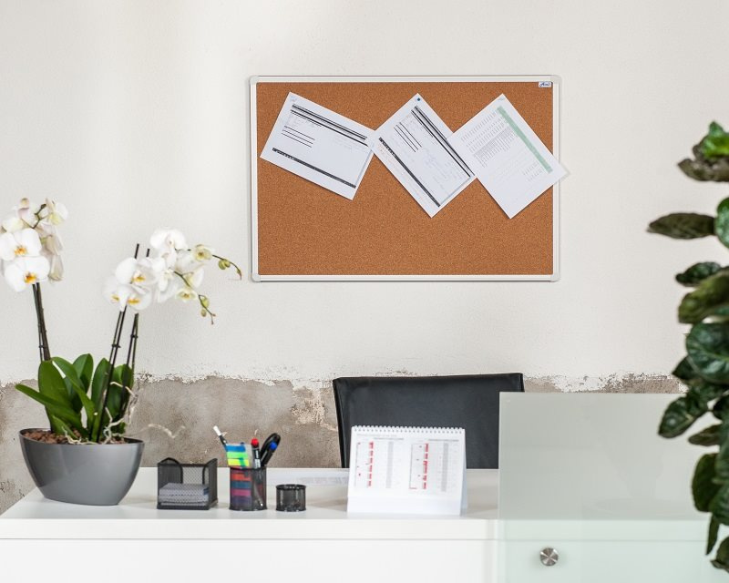 Korková nástěnka AVELI má vysoce odolný povrch proti poškození při práci s napínáčky a špendlíky. Má lehkou konstrukci a elegantní rám z kvalitního eloxovaného hliníku. Nástěnka má světle šedé plastové rohy, které zakryjí upevnění na zeď.