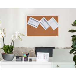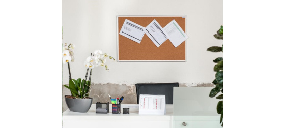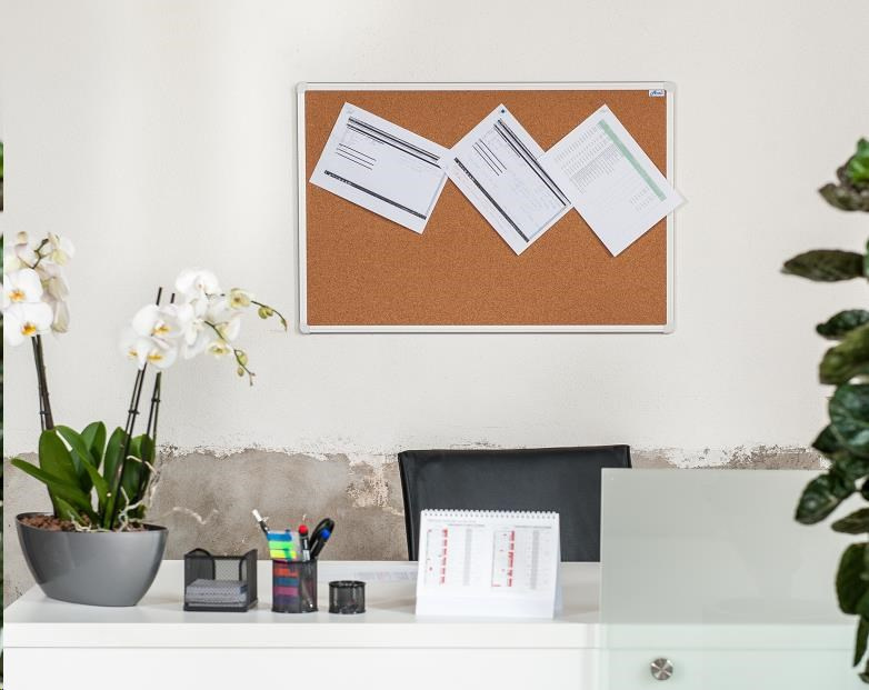 Korková nástěnka AVELI má vysoce odolný povrch proti poškození při práci s napínáčky a špendlíky. Má lehkou konstrukci a elegantní rám z kvalitního eloxovaného hliníku. Nástěnka má světle šedé plastové rohy, které zakryjí upevnění na zeď.