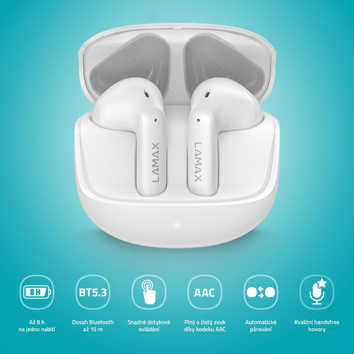 Nebuď bez hudby ani minutuBezdrátová sluchátka LAMAX Tones1 jsou našlapaný pecky od LAMAX! S rychlým Bluetooth 5.3 připojením a dosahem až 15 metrů si můžeš užívat svobodu pohybu a poslechu až 8 hodin na jedno nabití. Extra šťávu na dalších 32 hodin máš s sebou v pouzdru. Užij si parádní zvuk kdykoli a kdekoli, ať už při práci nebo legraci. Kvalitní mikrák pro hovory i ovládání nesmí chybět, tak mačkej play a vyraz ven!