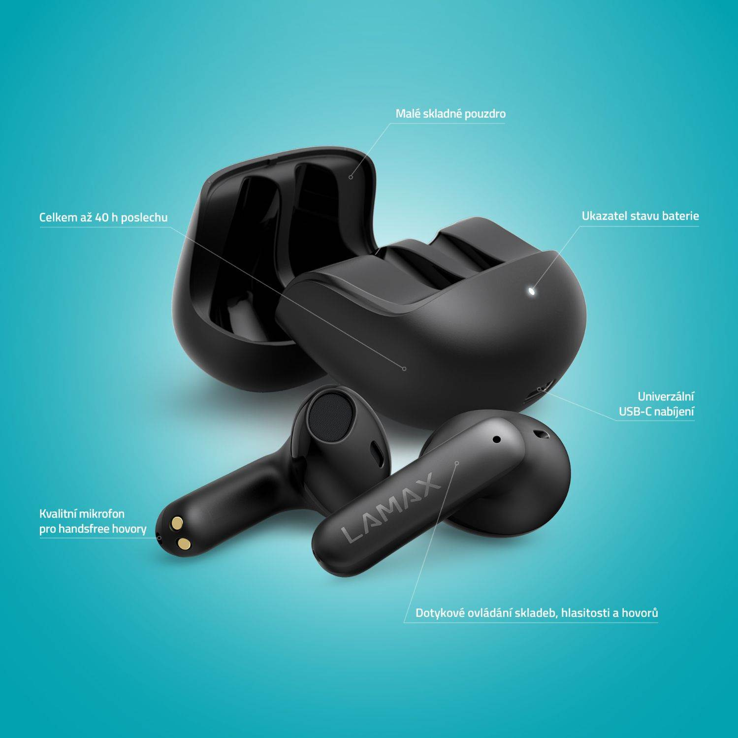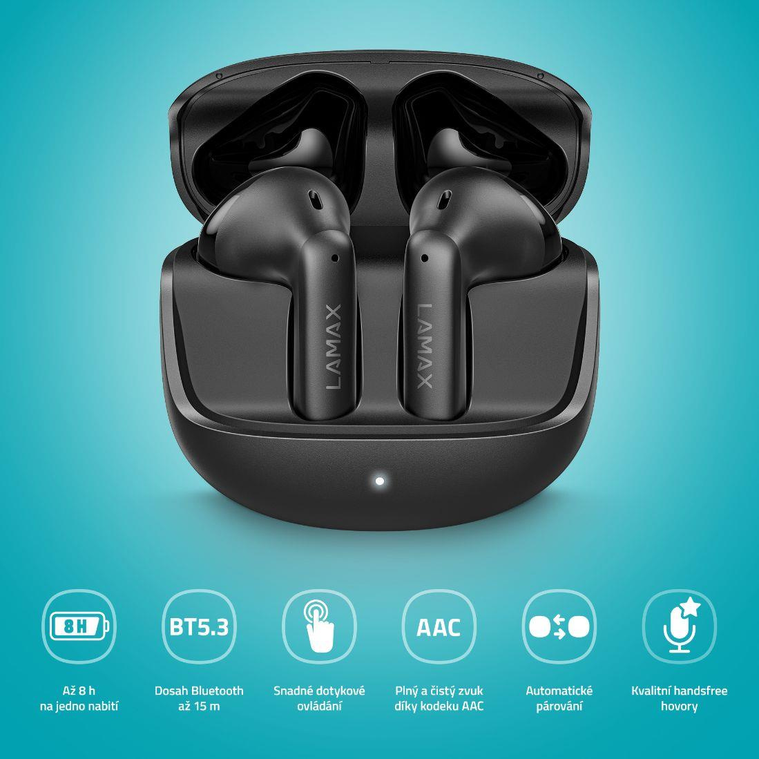Nebuď bez hudby ani minutuBezdrátová sluchátka LAMAX Tones1 jsou našlapaný pecky od LAMAX! S rychlým Bluetooth 5.3 připojením a dosahem až 15 metrů si můžeš užívat svobodu pohybu a poslechu až 8 hodin na jedno nabití. Extra šťávu na dalších 32 hodin máš s sebou v pouzdru. Užij si parádní zvuk kdykoli a kdekoli, ať už při práci nebo legraci. Kvalitní mikrák pro hovory i ovládání nesmí chybět, tak mačkej play a vyraz ven!