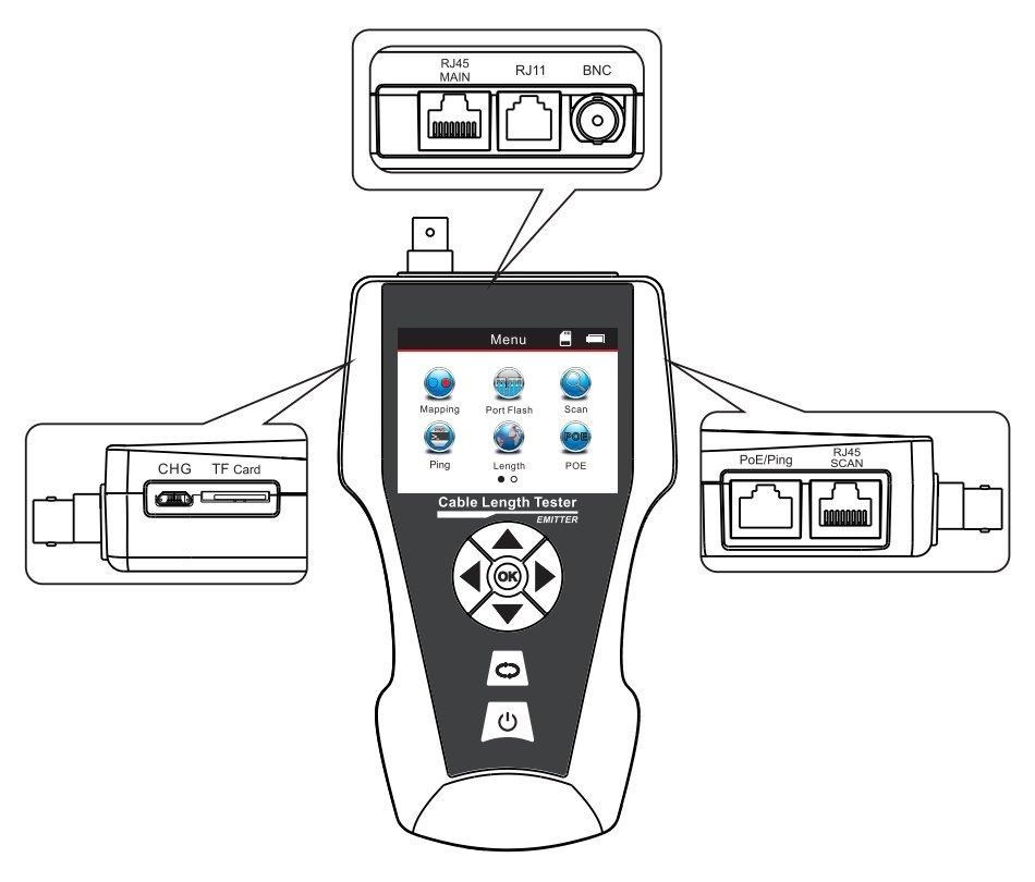 Pokročilý tester pro testování a diagnostiku různých typů kabelů/vedení. Využívá technologii TDR (Time Domain Reflectometry) k přesné lokalizaci a identifikaci závad ve vedení. Zařízení je vybaveno velkým LCD displejem, který zobrazuje všechny patřičné informace a podporuje vícejazyčné nastavení. Kromě toho je vybaven vestavěným tónovým generátorem a funkcí vyhledávání portů, takže je ideální pro testování síťových kabelů, telefonních linek a videokabelů. - Tester nabízí širokou škálu funkcí pro různé typy testování a diagnostiku. - Tester UTP/STP (RJ-45), koaxiálních (BNC), telefonních (RJ-11) a USB vedení. - Ohmické metody měření, včetně rozšířených testů napájení PoE a odezvy PING. Výbava: detekční sondy pro vyhledávání kabelového spojení, 1x protismyčka, barevný LCD displej