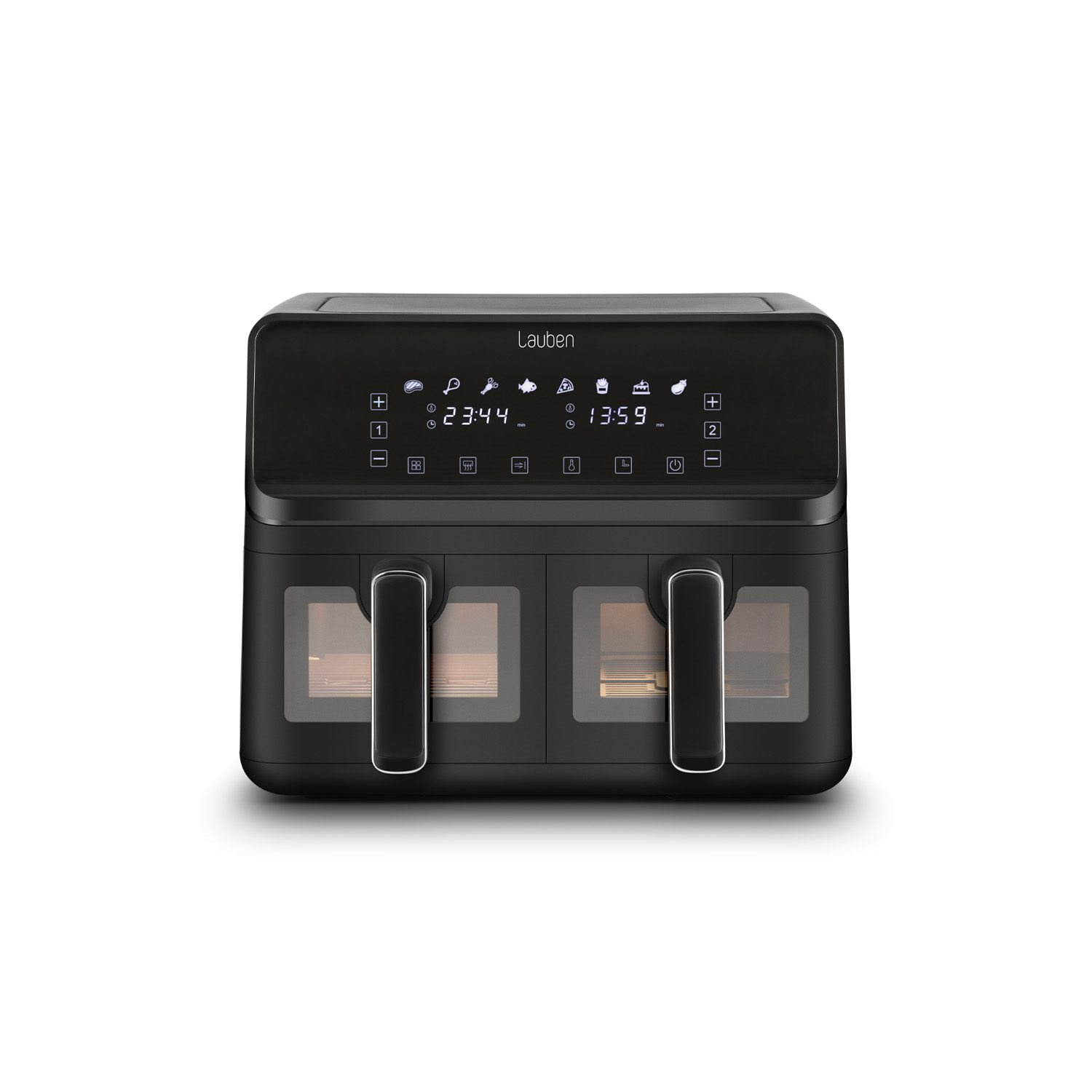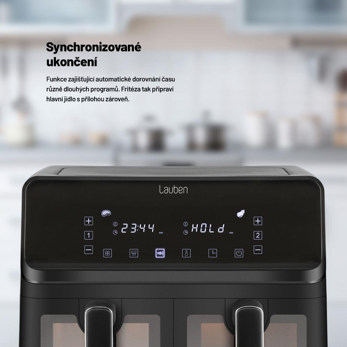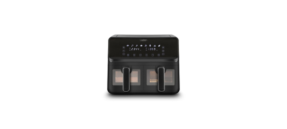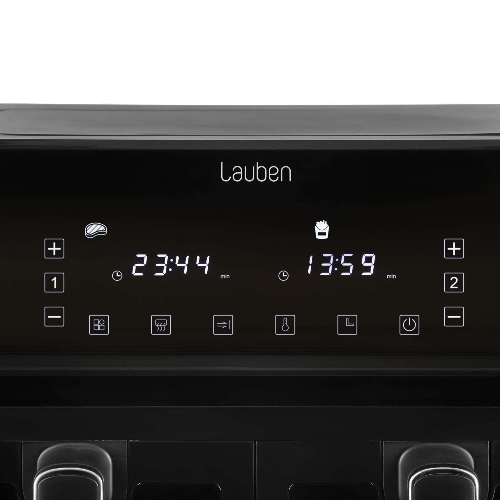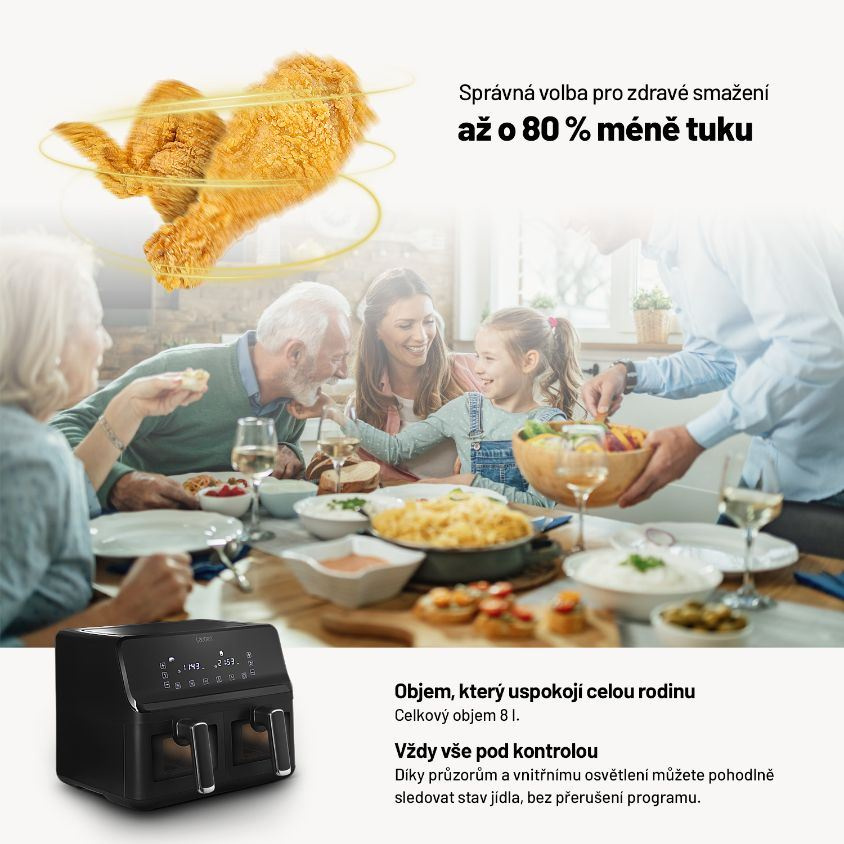 Horkovzdušná fritéza s dvěma koši, celkový objem 8 l, individuální nastavení obou košů zvlášť, možnost přípravy hlavního jídla a přílohy naráz, osvětlení interiéru, průhledná okénka pro vizuální kontrolu pokrmu, 8 přednastavených programů, možnost manuální úpravy času a teploty, technologie Cool Touch a Dualzone®, funkce předehřátí a synchronizované ukončení, přehledný dotykový displej, vnitřní tácy vhodné do myčky, prémiový matný design, 360° cirkulace horkého vzduchu, nastavitelná teplota: 80 – 200 °C, nastavení času 1 – 60 min, příkon 2700 W. elem6 s.r.o., Braškovská 308/15 161 00 Praha 6 Czech republic, podpora@lauben.com