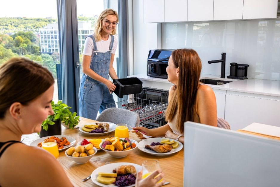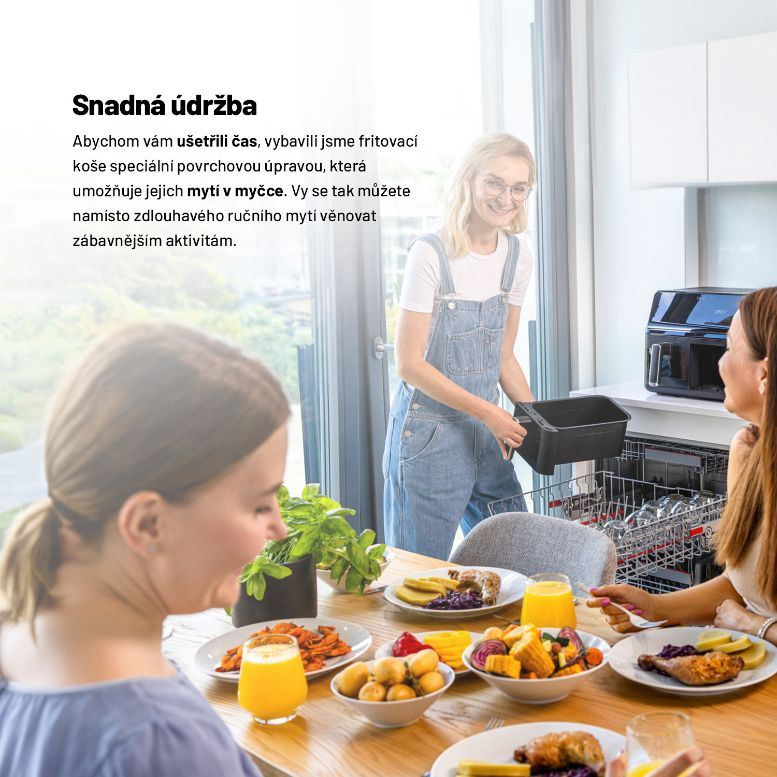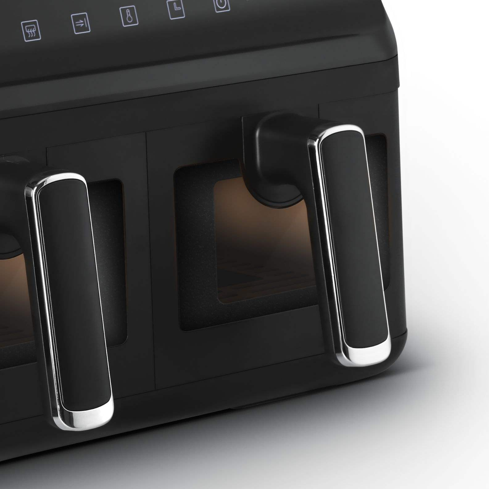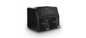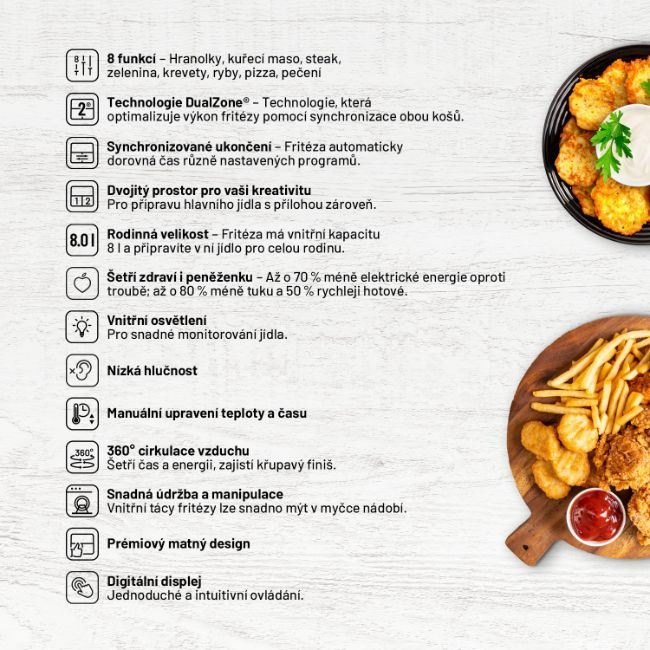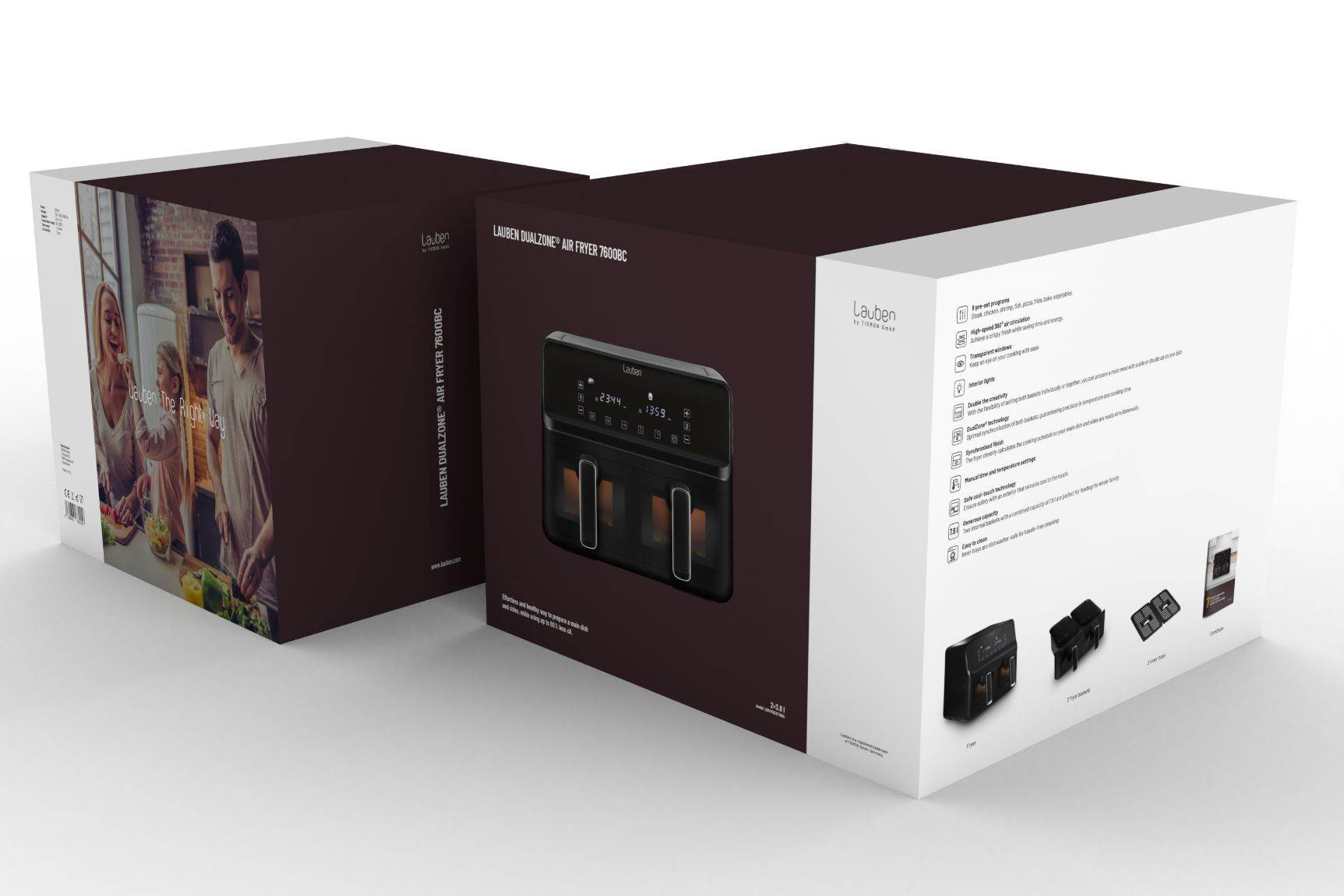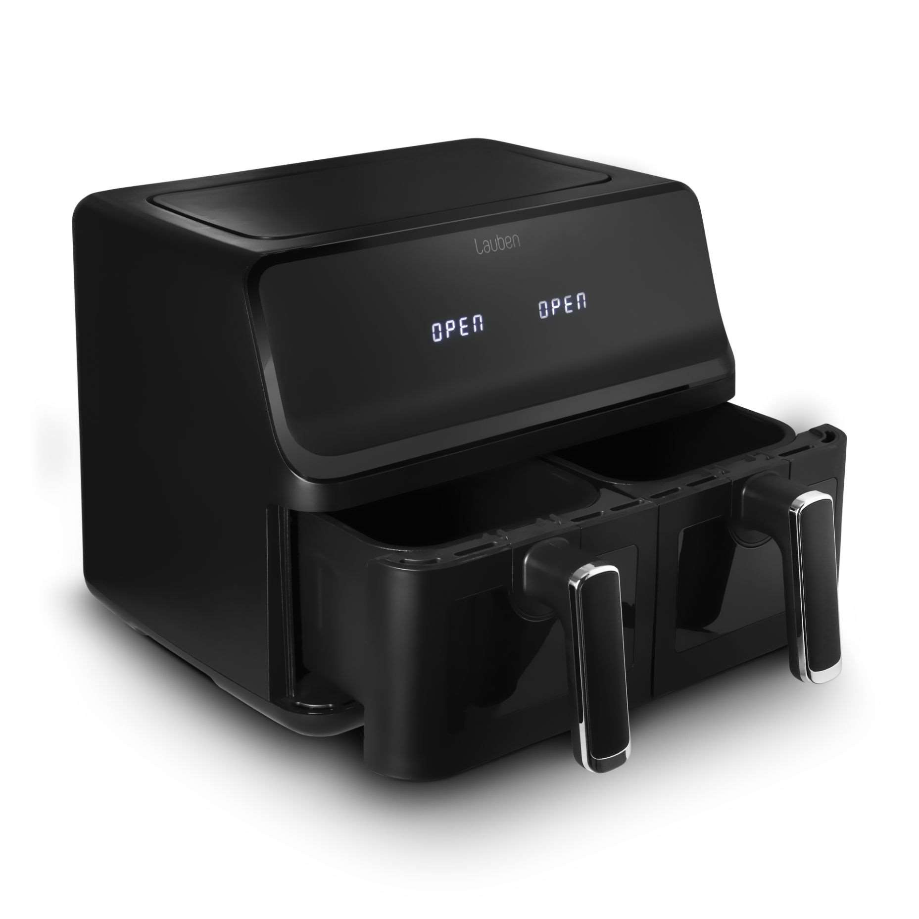 Horkovzdušná fritéza s dvěma koši, celkový objem 8 l, individuální nastavení obou košů zvlášť, možnost přípravy hlavního jídla a přílohy naráz, osvětlení interiéru, průhledná okénka pro vizuální kontrolu pokrmu, 8 přednastavených programů, možnost manuální úpravy času a teploty, technologie Cool Touch a Dualzone®, funkce předehřátí a synchronizované ukončení, přehledný dotykový displej, vnitřní tácy vhodné do myčky, prémiový matný design, 360° cirkulace horkého vzduchu, nastavitelná teplota: 80 – 200 °C, nastavení času 1 – 60 min, příkon 2700 W. elem6 s.r.o., Braškovská 308/15 161 00 Praha 6 Czech republic, podpora@lauben.com