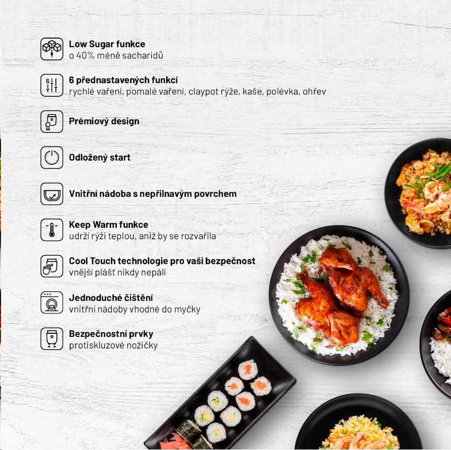 Rýže s až o 40 % nižším obsahem sacharidůLauben Low Sugar Rice Cooker je víceúčelový prémiový rýžovar s funkcí low sugar, při níž díky speciální technologii vaření dochází k separaci sacharidů. S tímto pomocníkem dovedete k dokonalosti všechny druhy rýže a díky 6 nastavitelným režimům rychle vytvoříte zdravá a chutná jídla i z dalších surovin. S rýžovarem Lauben připravíte luštěniny, polévku nebo třeba ovesnou kaši, aniž byste zapnuli sporák.
