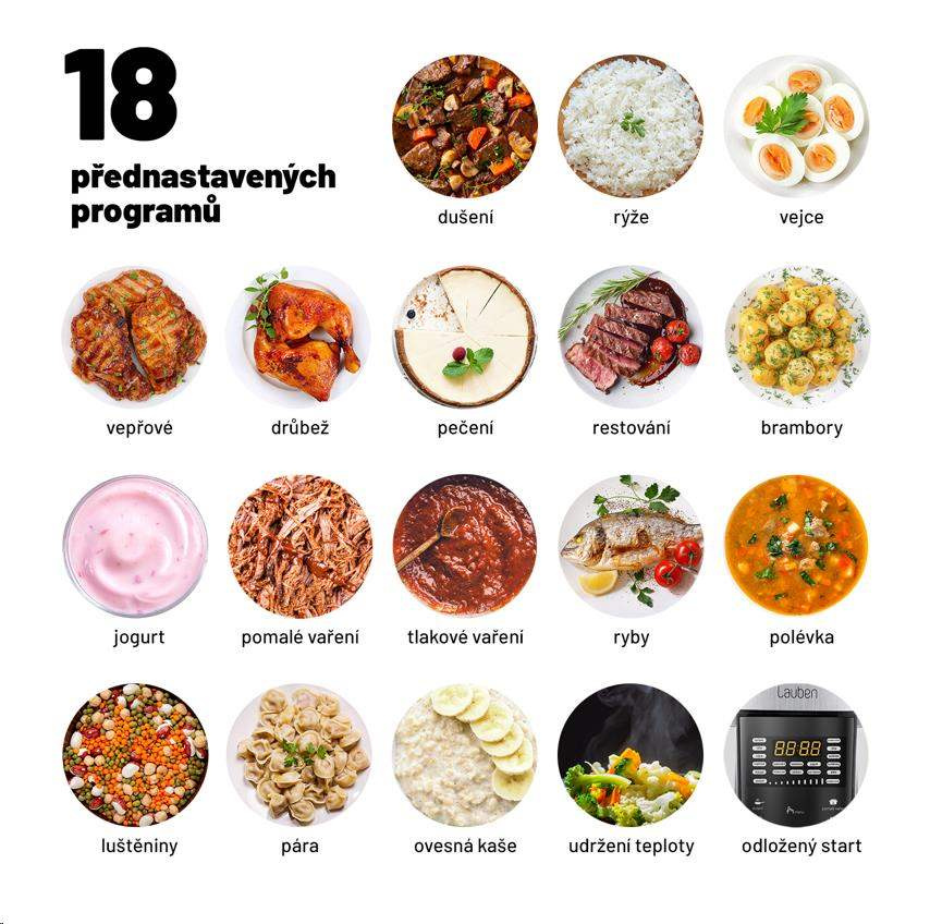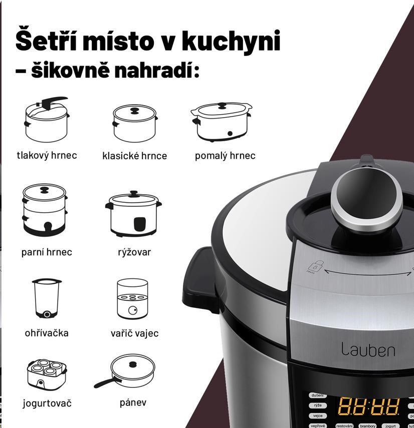 Jeden přístroj, nespočet možnostíLauben Multi Cooker 18SB je multifunkční tlakový hrnec, který vám díky 18 přednastaveným programům ušetří v kuchyni spoustu času a námahy. Kromě tlakového hrnce, slow cookeru, nebo rýžovaru, nahradí i vařič vajec, parní hrnec, jogurtovač, nebo ohřívačku. Ušetříte spoustu místa v kuchyni a připravíte širokou paletu pokrmů. Hrnec se snadno ovládá pomocí přehledného dotykového displeje, který je kompletně v češtině. Hlavní nádoba má dostatečnou kapacitu 6 litrů, je z nepřilnavého materiálu a lze mýt v myčce nádobí. Multicooker nabízí i funkci odloženého startu nebo udržování teploty. Navíc je kompaktní, a vy si tak můžete dopřát rychlé, zdravé a bezpečné vaření nejen doma, ale i na chatě nebo na dovolené. Lauben Multi Cooker 18SB je ideálním pomocníkem do kuchyně právě pro vás, pokud chcete mít na talíři vždy perfektní výsledek, ale nechce se vám obětovat hodiny strávené u sporáku, nebo spoustu peněz do kuchyňského vybavení.