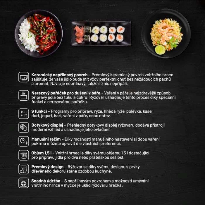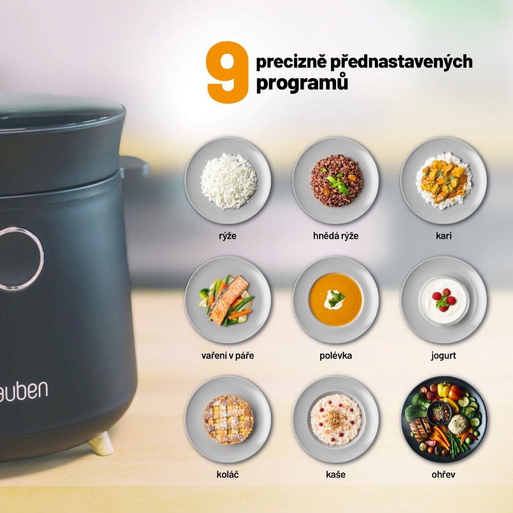 - 9 přednastavených programů: rýže, hnědá rýže, polévka, kaše, dort, jogurt, kari, vaření v páře, ohřev
