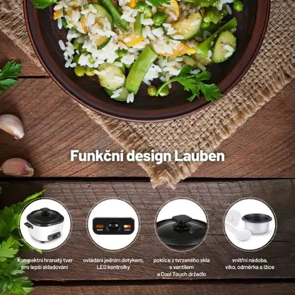 Uvařit vláčnou a nadýchanou rýži je často mnohem těžší, než by se mohlo zdát. S rýžovarem Lauben je to ale stejně jednoduché, jako si tuto oblíbenou přílohu vychutnat. Jeho využití je všestranné, připravíte v něm jakýkoli druh rýže přesně al dente, stisknutím jednoho tlačítka. Ale poradí si i s jinými surovinami. Během několika minut za vás zvládne lahodné polévky, krémovou cereální kaši nebo luštěniny bohaté na bílkoviny. Samozřejmostí je funkce Keep warm, díky které je rýžovar schopný udržet rýži teplou tak dlouho, jak potřebujete, aniž by se rozvařila a ztratila dokonalou chuť nebo strukturu.