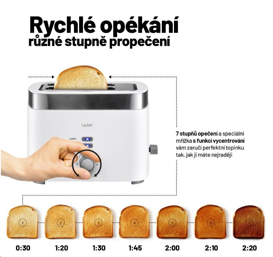 Každý druh pečiva potřebuje jiné nastavení, stejně tak každý máme jiné chutě. S Lauben Toaster si můžete vybrat ze 7 stupňů opečení pečiva, na své si tak přijdou milovníci pečiva opečeného dohněda i ti, kteří raději lehce zlatavou křupavou variantu.