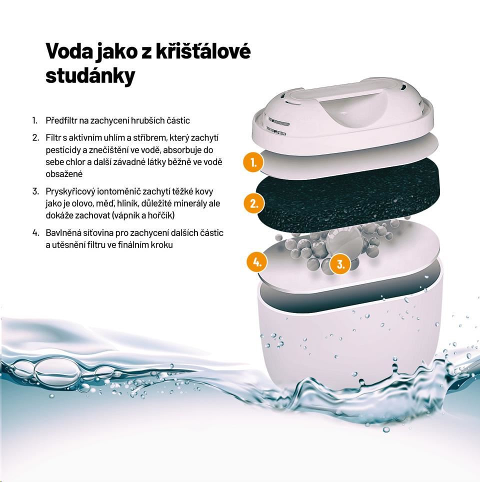 Balení tří kusů filtrů s čtyřstupňový filtračním systémem. Předfiltr zachytí hrubší částice, následně filtr z aktivního uhlí eliminuje pesticidy a znečištění ve vodě, absorbuje chlor a další závadné látky. Následně voda projde pryskyřicovým iontoměničem zachycujícím těžké kovy, avšak při zachování důležitých minerálů – vápník a hořčík. Poslední stupeň čištění představuje bavlněná síťovina pro zachycení dalších částic a utěsnění filtru, jehož kapacita činí 160 l.