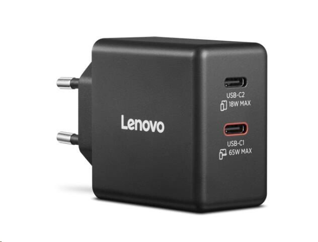 Lenovo Dual USB-C 65W GaN Charger je kompaktní a výkonná nabíječka s moderní GaN technologií, která umožňuje rychlé a současné nabíjení více zařízení v kanceláři i na cestách.