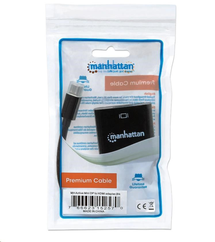 Manhattan Active Mini DisplayPort to HDMI Adapters establish a fast and convenient connection between a media source equipped with a Mini DisplayPort and an HDMI display cable. This active adapter overcomes the non-DP++ (dual-mode) video/graphics card's limitations and converts the signal to display. Ideal for multi-screen gaming, digital signage in retail displays, financial market and other applications. Nickel-plated contacts and full shielding help Manhattan Active Mini DisplayPort to HDMI Adapters provide clear and stable video transmissions in UHD, home and office multimedia applications. Durable PVC jackets and molded boots with strain relief help ensure connections remain uninterrupted and steady.