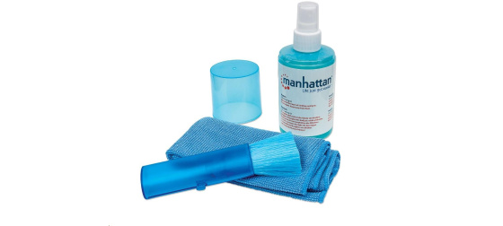 The Manhattan LCD Cleaning Kit gently cleans and removes dirt, fingerprints and smudges from most LCD surfaces, making it ideal for use with flat panel displays, televisions, notebook computers and other electronics. A soft, synthetic brush gently eliminates excess dust and debris without scratching. The bristles retract into the handle to keep them clean and protected. The non-aerosol cleaning solution safely and thoroughly removes fingerprints and smudges without harsh solvents or abrasives. A soft, lint-free microfiber cloth gently cleans, dries and polishes for a clear, non-streak finish.