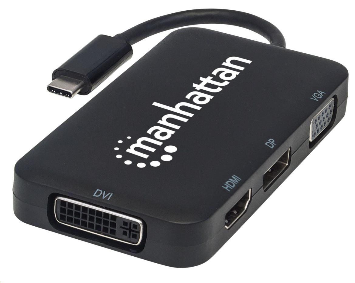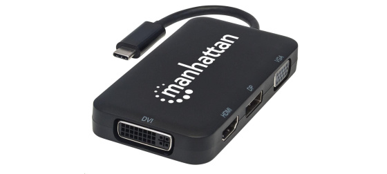 The Manhattan USB-C 4-in-1 Audio/Video Converter establishes a fast, simple and convenient link between newer USB Type-C equipped media sources (computers, tablets, Smartphones, etc.) and existing HDMI, DisplayPort, VGA or DVI displays (monitors, projectors, etc.). The Manhattan USB-C 4-in-1 Audio/Video Converter is easy and quick to install — no complicated configuration or setup required. Its all-in-one design achieves a compact, integrated solution that eliminates unnecessary cables, tangles and clutter to keep installations and workspaces neat and orderly. Extend the service life of your equipment, and fully realize the investment and value of your HDMI, DP, VGA or DVI displays, projectors and peripherals with a Manhattan USB-C 4-in-1 Audio/Video Converter.