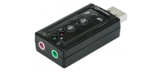 Ideal for desktop, notebook and netbook computers, the Manhattan Hi-Speed USB 3D 7.1 Sound Adapter instantly creates microphone-in and audio-out ports through any USB port. Easily connect headsets, microphones and speakers equipped with 3.5 mm cables that are too short to reach ports in awkward or inconvenient locations comfortably. With plug-and-play and hot-swap capabilities, it easily replaces inoperative sound cards, bypasses damaged audio ports and improves access without special drivers or software. A built-in Class-B power amplifier utilizes USB bus power, eliminating the need for external energy supplies or additional cables. Support for 3D audio and virtual 7.1 surround sound and built-in sound effects with a 10-band equalizer deliver rich, high-quality experiences with familiar USB convenience and functionality.