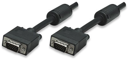 Manhattan SVGA Cables easily connect a monitor with a desktop or notebook computer. Ideal for use with video splitters, KVM switches and any HD15-equipped display, computer or device, Manhattan SVGA Cables are engineered and constructed of quality materials to deliver dependable transmissions in video applications. Full foil and braided shielding with ferrite cores help minimize EMI interference and mini-coax (RGB) with paired video wire construction combine to provide maximum conductivity and clear, crisp images with reduced distortion over extended distances.