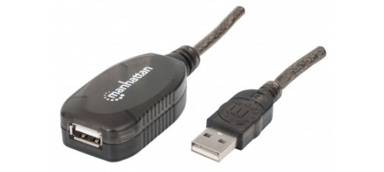 Use the Manhattan Hi-Speed USB Active Cable to connect a computer USB port to a USB device almost anywhere in the room. Daisy-chain 2 cable extensions to provide a convenient, 40m (131-ft.) connection. Manhattan Hi-Speed USB Active Cable with built-it repeater is fully-compliant with USB 1.1 and Hi-Speed USB specifications to help devices operate at maximum performance. Plug-and-play capability, Windows/Macintosh versatility and no external power or driver requirements help provide greater flexibility in computer and peripheral placement and office layout.