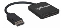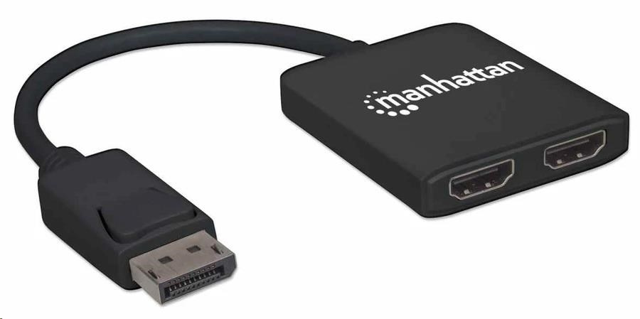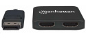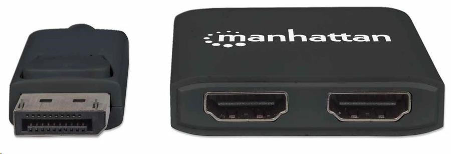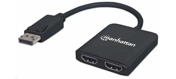 The Manhattan DisplayPort to Dual HDMI - MST Hub streams a 4K DisplayPort (DP) signal from a single UHD source to up to two UHD HDMI displays.
