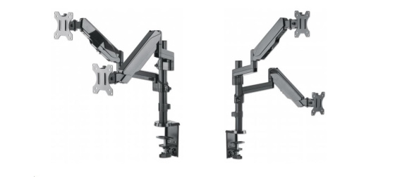 The Manhattan Universal Gas Spring Dual Monitor Mount securely supports two 17" to 32" TVs or monitors. Because it uses gas springs to hold your displays, the arms only need the lightest touch to move them to the best viewing angles for your purposes. The mount's high-quality aluminum and steel construction will provide years of reliable service. Ideal for installation on a large desk, the Manhattan Universal Gas Spring Dual Monitor Mount lets you take advantage of the extra range of movement so you can have more space to get work done.