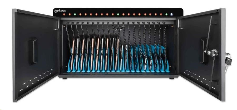Keep your devices organized in the 20 bays with 264 (D) x 22 (W) x 235 (H) mm / 10.39 x 0.87 x 9.25 in. each. Use the cable management built into the dividers to structure your charging cables (available from Manhattan). As this Desktop Charging Cabinet features USB-C ports instead of AC outlets, you do not need additional wall chargers. The AC input on the back is a C20 connector that lets you replace the included power cable with other cables based on your region.