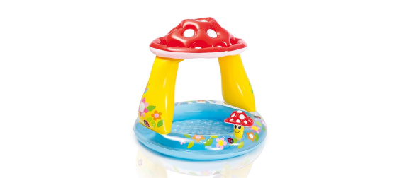 Nafukovací dětský bazének se stříškou ve tvaru muchomůrky. Stříška chrání dítě před slunečními paprsky. Stříška je nafukovací. Měkká nafukovací podlaha zajistí bezpečné a pohodlné hraní. Součástí je malá veselá nafukovací mochomůrka.Vhodné jako brouzdaliště.