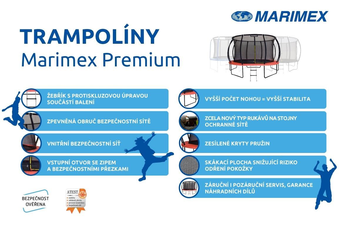 Trampolíny Marimex Premium nevynikají pouze novým designem a barevností, ale také větší stabilitou, pevností a bezpečností. Bezpečnost zajišťují zesílené ochranné kryty pružin a nová technologie T-spojů. Vnitřní ochrannou síť podpírá osm dynamicky prohnutých tyčí a napnutou ji drží zpevněná horní obruč. Skákací plocha je vyrobena z velmi odolného a neabrazivního materiálu s vysokou životností.