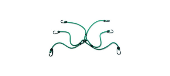 Set 3ks vzájemně propojených upínacích gum zakončených háčky, tzv. „pavouk“. Délka gumy 800 mm a Ø8 mm. Maximální nosnost 40 kg. Háčky z dvojitého drátu pro větší pevnost v tahu. Zaoblené konce háčků zabraňující poškrábání. Barva: zelená Cena za set