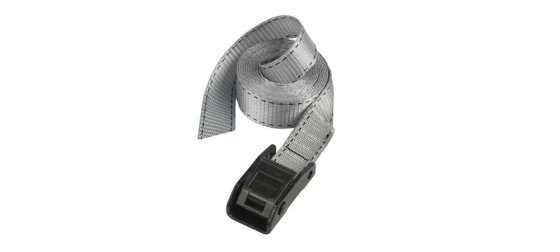Upínací popruh s vyztuženou přezkou. Délka 5 000 mm a šířka 25 mm. Vyztužená přezka pro vyšší nosnost. Maximální nosnost 150 kg. Barva: šedá Cena za kus