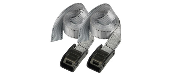 Set 2ks upínacích popruhů s vyztuženou přezkou. Délka 2 500 mm a šířka 25 mm. Vyztužená přezka pro vyšší nosnost. Maximální nosnost 150 kg. Barva: šedá Cena za set