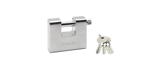 Obdélníkový visací zámek o šířce 80 mm a tloušťce 30 mm.