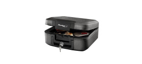 Uzamykatelný bezpečnostní kufr odolný ohni a vodě LCHW20101 z pevné ocelové konstrukce je vhodný pro uchování digitálních médií a písemností ve formátu max. A4. Objem činí 7,8l. 2ks klíčů a praktické držadlo jsou součástí balení..