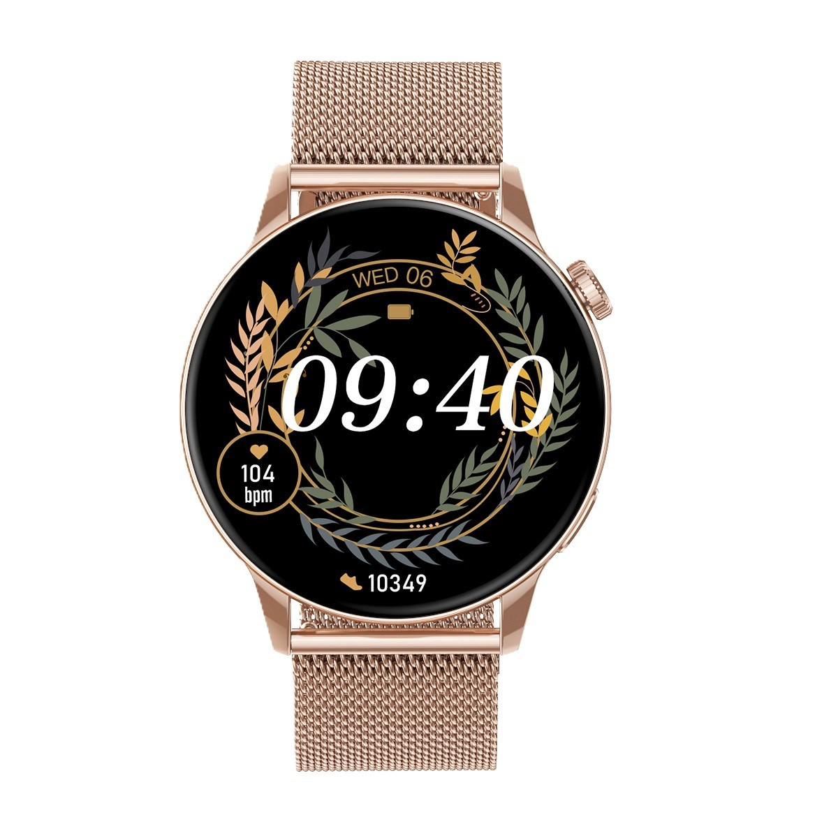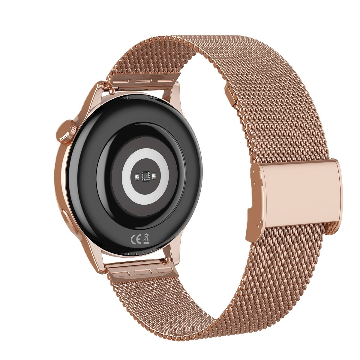 Chytré funkce:Předpověď počasí; Tvar ciferníku:Kulatý; Typ displeje:AMOLED; Barva pouzdra:Zlatá; Barva řemínku:Zlatá; Úhlopříčka displeje:1,3"; Kapacita baterie (mAh):200; Zařízení:Hodinky; Funkce:Měření tepu, Nabíjecí.Více