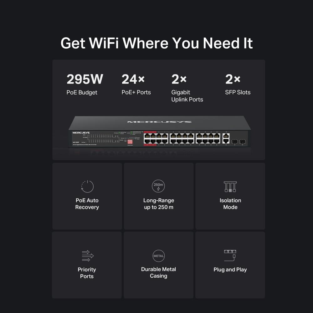 | Interfaces | • 24× 10/100/1000 Mbps PoE+ RJ45 Ports |