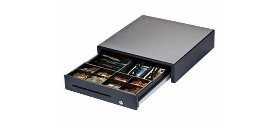 cash drawer, front opening, dimensions (WxHxD): 410x114x415mm, insert: 6 note compartments, 8 coin compartments, 1 receipt compartment, direct printer connection, RJ12, colour: dark grey.