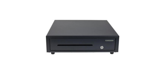 cash drawer, front opening, dimensions (WxHxD): 410x114x415mm, insert: 6 note compartments, 8 coin compartments, 1 receipt compartment, direct printer connection, RJ12, colour: black.